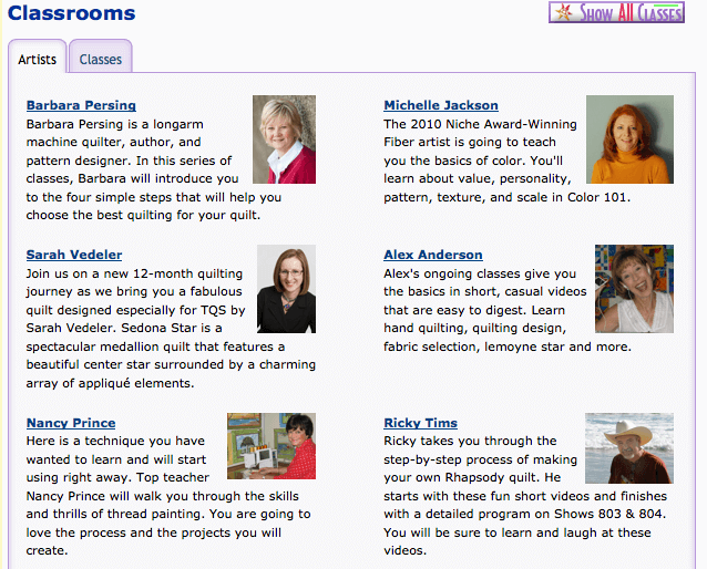 Speaking of The Quilt Show with Alex Anderson and Ricky Tims, I have been enjoying the currect episodes, on all kinds of new techniques, plus a class on color. Really outstanding material. Here’s just a selection of classes: