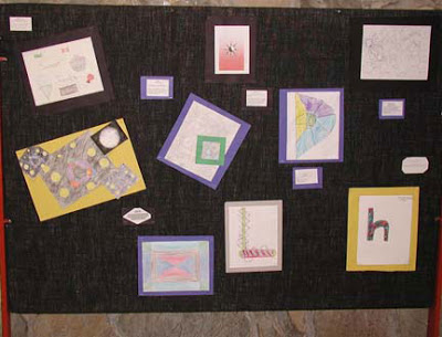 I think back to learning Pagemill waaaaayyyyy back when I was just starting my website in 1998…I still know a little code from teaching myself. Everything I’ve done has been self-taught, so I love the opportunities the kids have. About two weeks ago I walked to the end of the hallway to discover a new exhibit of student work, using Illustrator – a program I just haven’t had time to explore. The kids had to recreate some organic shapes (the pen tool makes me nuts….) and use some filters to develop their piece even further. All I could think of was what cool quilts these would make. There is glare (and the remains of some graffiti) on the showcase window, but I think you can get a good idea of what the kids are doing.
