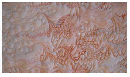 You need a piece of marbled fabric. We’re starting with a freeform pattern, made by creating the stones by dropping paint on the carrageenan bath. Then using a stylus, we swirl the paint around the whole piece. This gives us the effect you see here. This also involves the first very basic marbling pattern, the very organic-looking stone. From this pattern, using a variety of different combs and rakes, you can get very complex patterns. But let’s start with this pretty basic pattern.